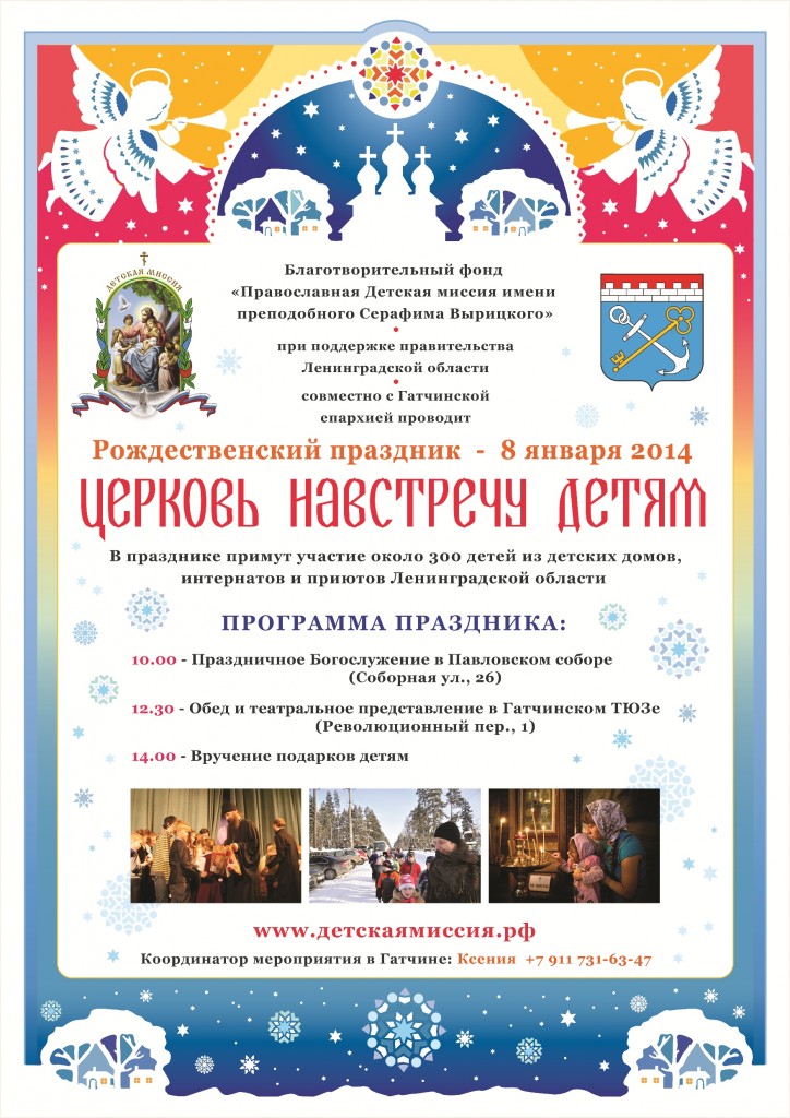 Благотворительный фонд «Православная детская миссия имени преподобного Серафима Вырицкого» совместно с Гатчинской епархией и при поддержке правительства Ленинградской области проводит Рождественский праздник «Церковь навстречу детям» 8 января 2014 г. В празднике примут участие около 300 детей из детских домов, интернатов и приютов Ленинградской области.