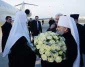 В аэропорту Пулково Предстоятеля Русской Православной Церкви встречали: митрополит Санкт-Петербургский и Ладожский Варсонофий, управляющий делами Московской Патриархии; губернатор Санкт-Петербурга Г.С. Полтавченко; губернатор Ленинградской области А.Ю. Дрозденко; викарии Санкт-Петербургской епархии; епархиальные архиереи и духовенство Санкт-Петербургской митрополии.