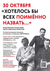 30 октября 2020 года, в общероссийский День памяти жертв советских репрессий, в Гатчине по благословению Его Преосвященства епископа Гатчинского и Лужского Митрофана состоится ежегодная акция «Молитва памяти».