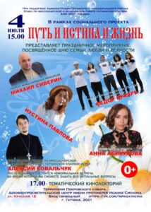 В программе мероприятия — праздничный концерт при участии Анны Абикуловой, Михаила Сиверина, Иустинии Павловой, Клуба детского творчества «Победа» под руководством Фёдора Кухаря. После концерта состоится беседа с председателем Отдела по миссионерской и молодёжной работе Гатчинской епархии иереем Алексием Ковальчуком, которому вы сможете задать все актуальные вопросы. Вход на мероприятие свободный, приглашаем всех желающих.