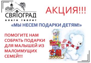 Отдел по церковной благотворительности и социальному служению Гатчинской епархии проводит акцию по сбору подарков к празднику Рождества Христова для для многодетных и малоимущих семей. Акция проводится с 18 декабря по 6 января.