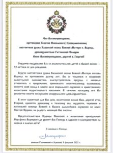 5 февраля 2022 года Преосвященнейший епископ Гатчинский и Лужский Митрофан направил поздравительный адрес по случаю 50-летнего юбилея настоятелю храма Казанской иконы Божией Матери п. Вырица протоиерею Георгию Николаевичу Преображенскому.